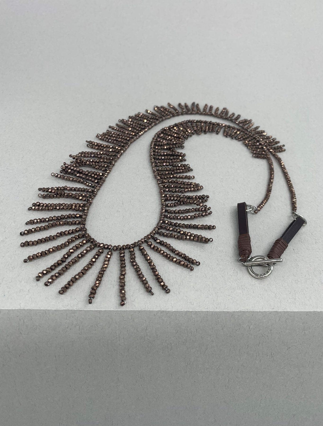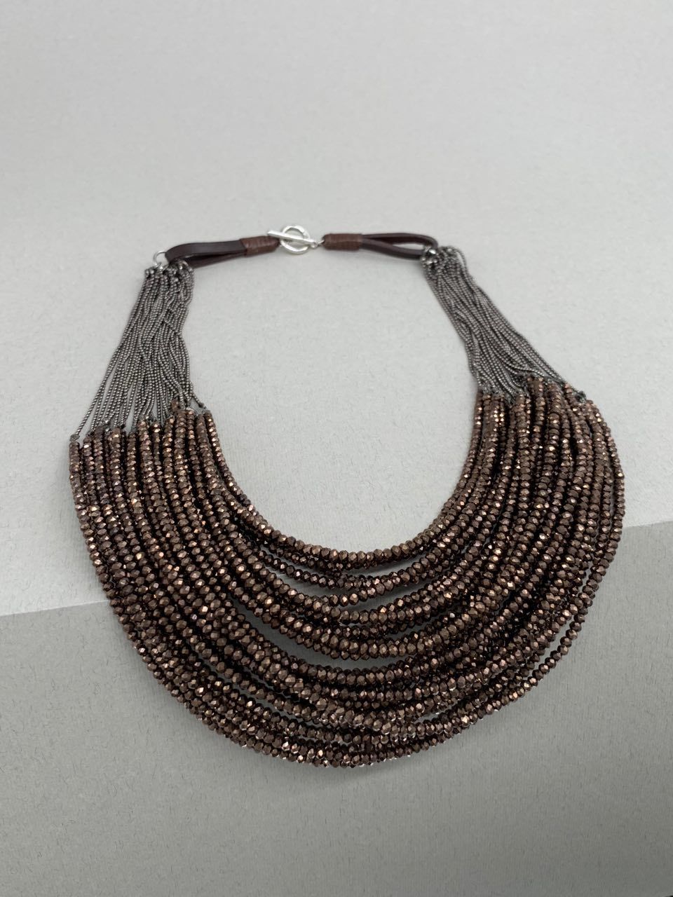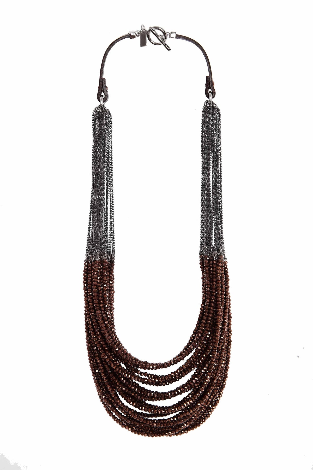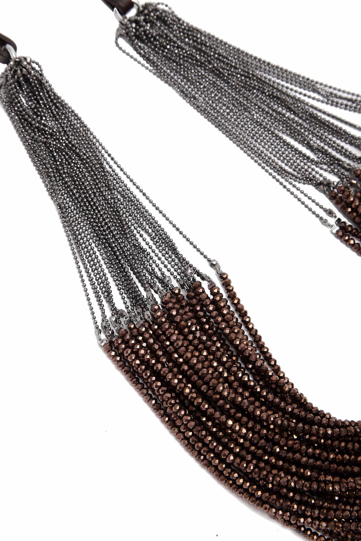 Graphite-colored crystal beads, thanks to their faceting, refract light in a special way, creating an effect of incredible radiance. Flat cord made of natural brown leather. Magnetic lock and branded hardware are rhodium plated to protect against scratches and abrasion.