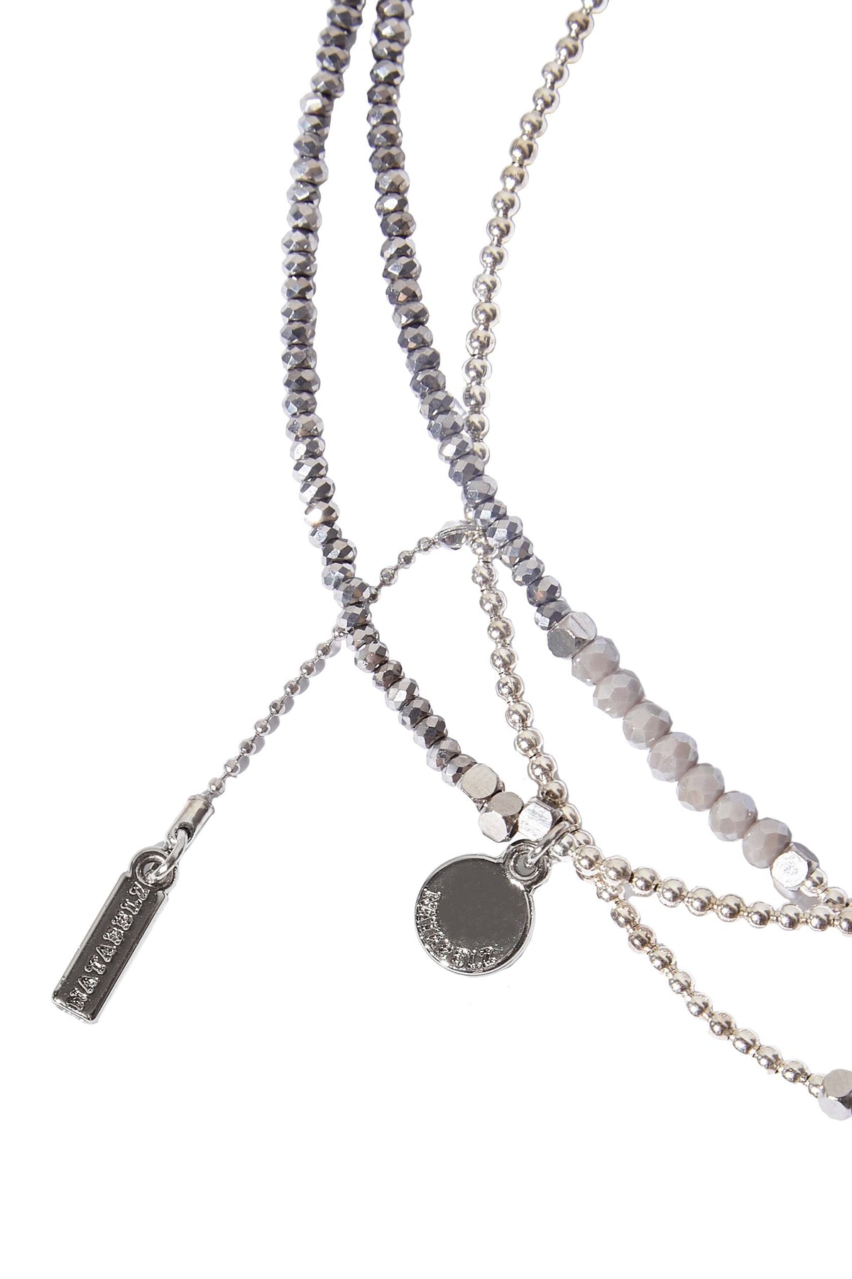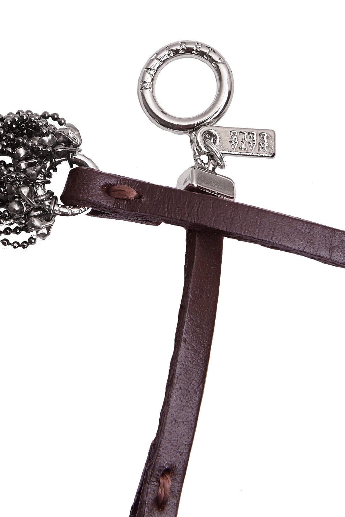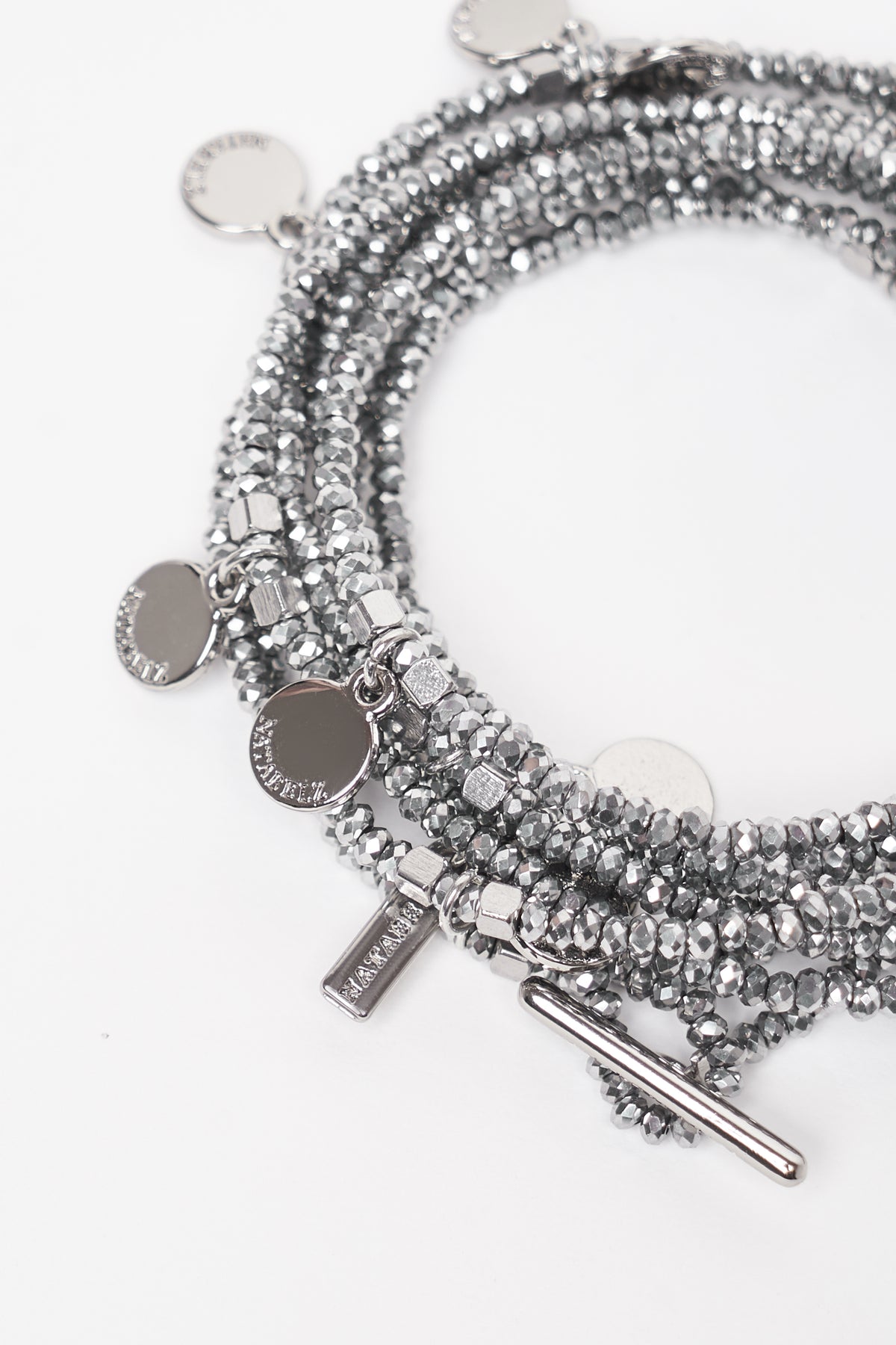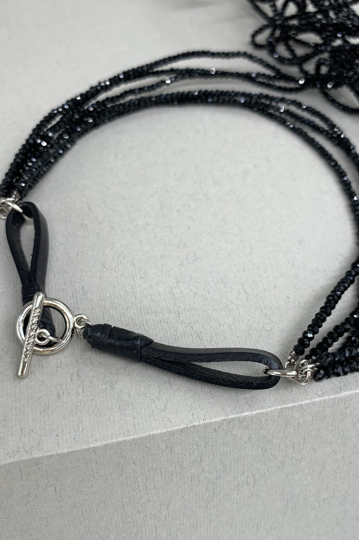 Graphite-colored crystal beads, thanks to their faceting, refract light in a special way, creating an effect of incredible radiance. Flat cord made of natural brown leather. Magnetic lock and branded hardware are rhodium plated to protect against scratches and abrasion.