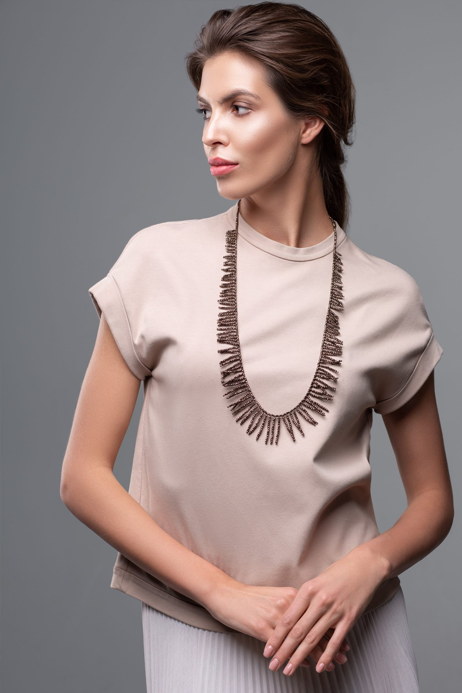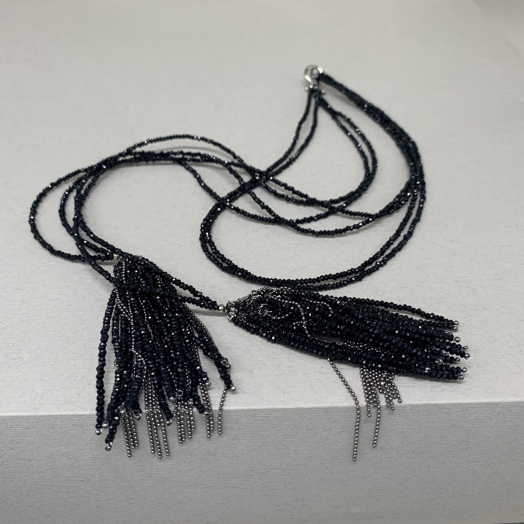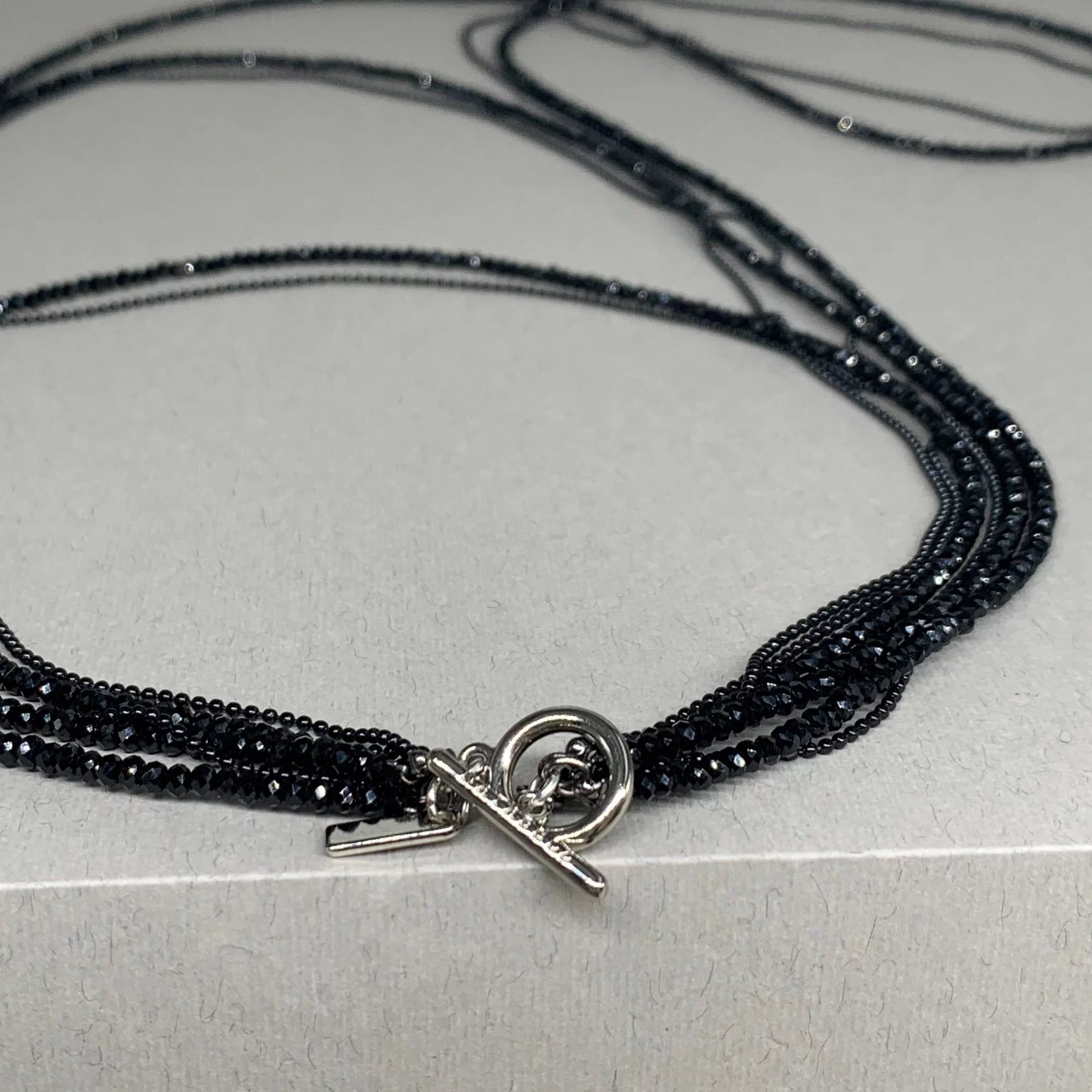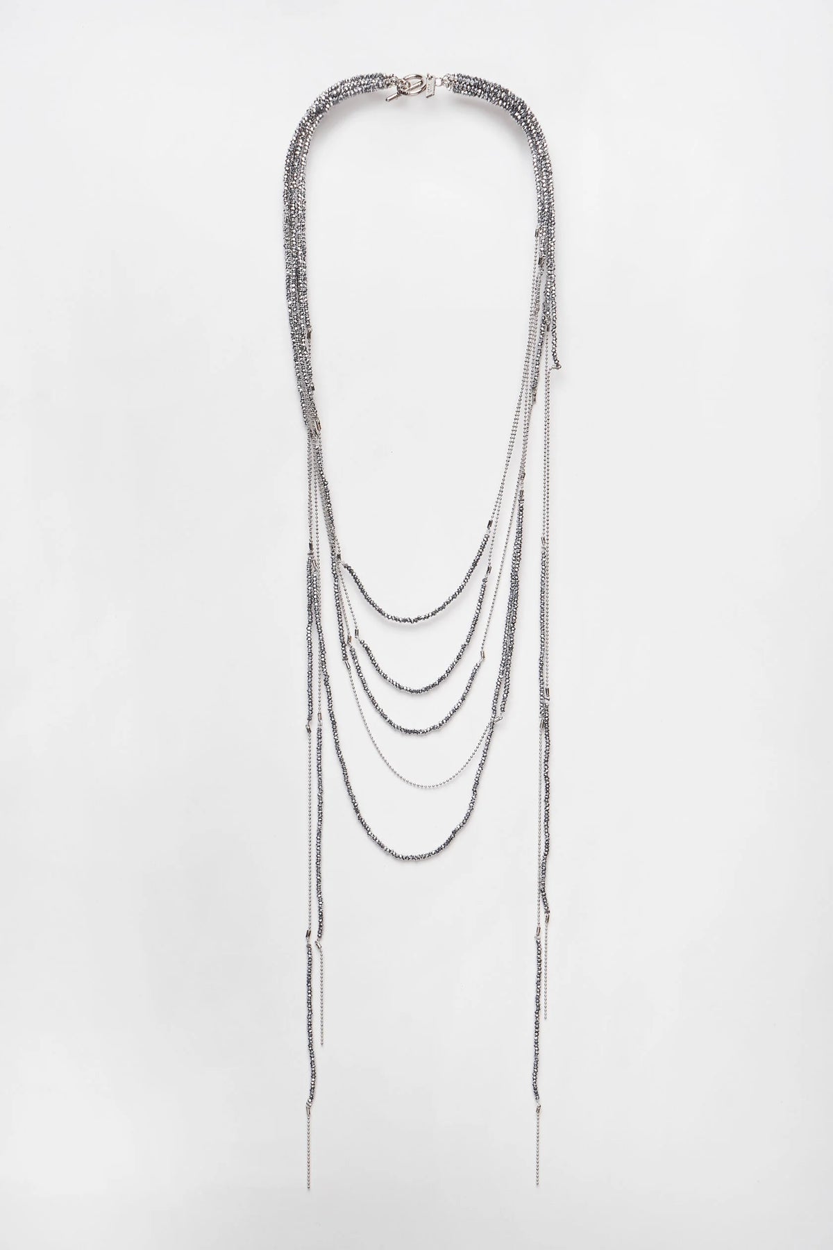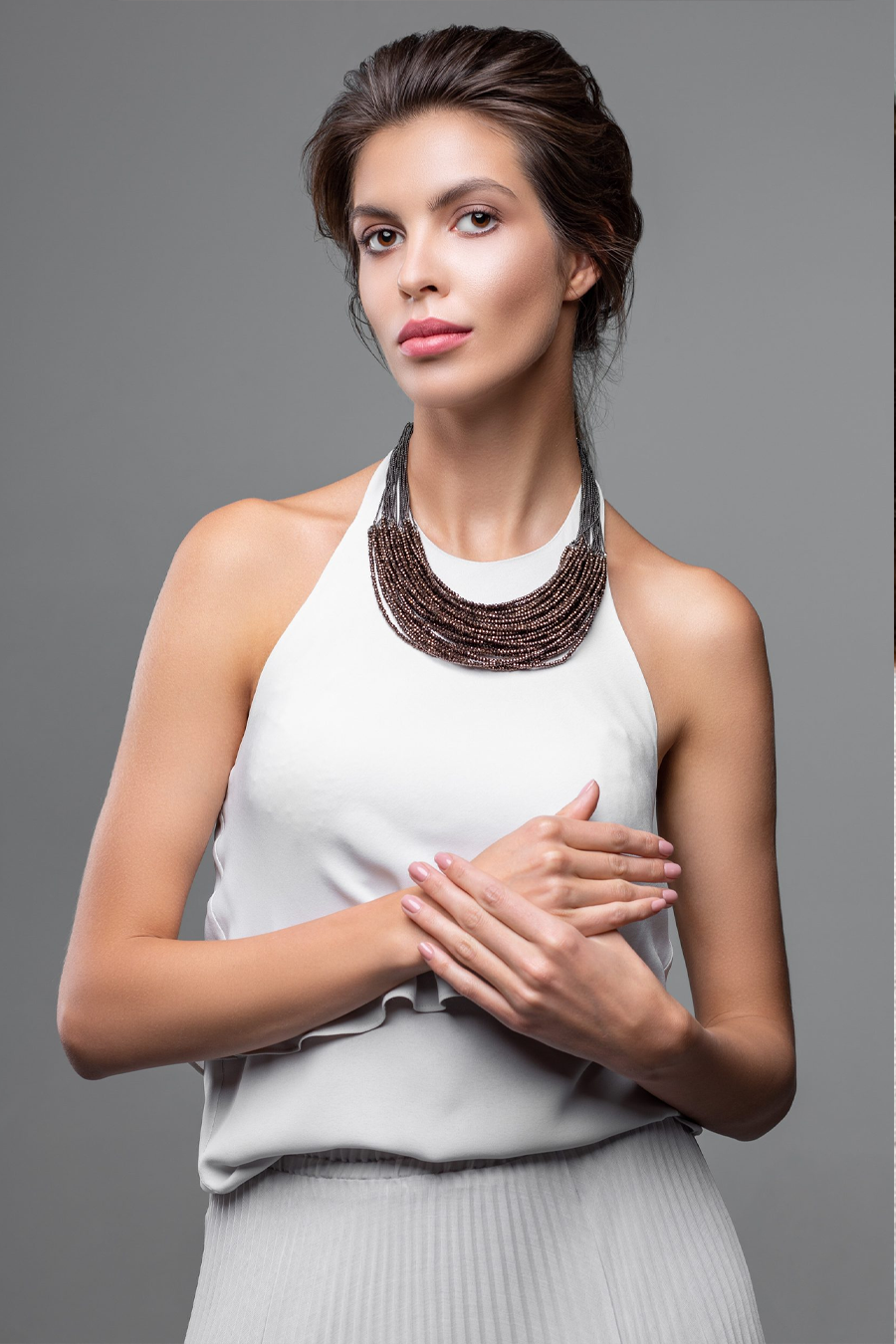 Graphite-colored crystal beads, thanks to their faceting, refract light in a special way, creating an effect of incredible radiance. Flat cord made of natural brown leather. Magnetic lock and branded hardware are rhodium plated to protect against scratches and abrasion.