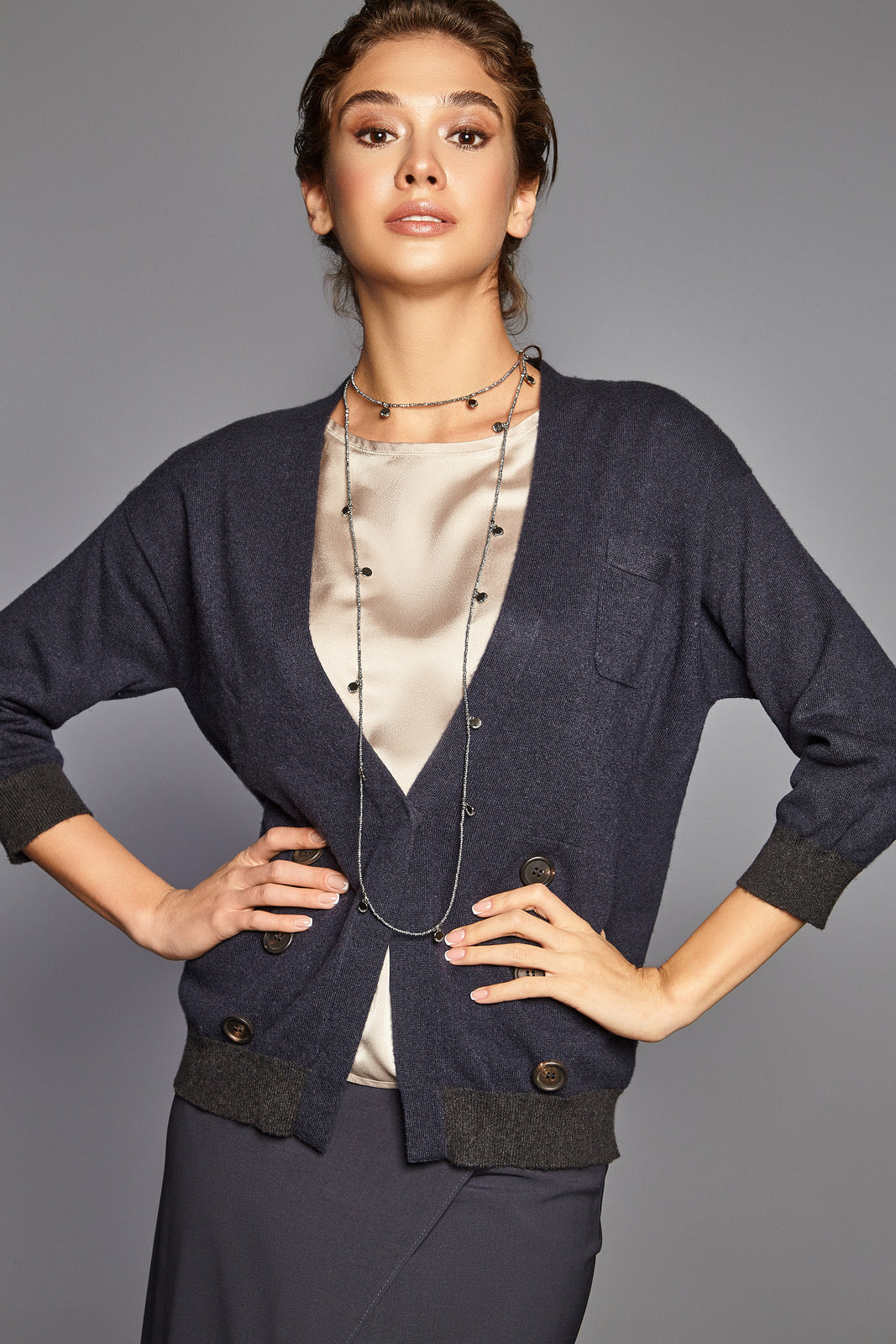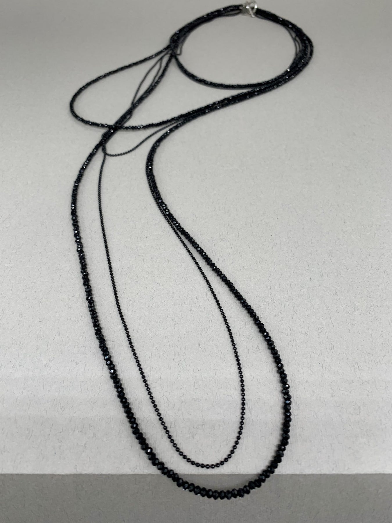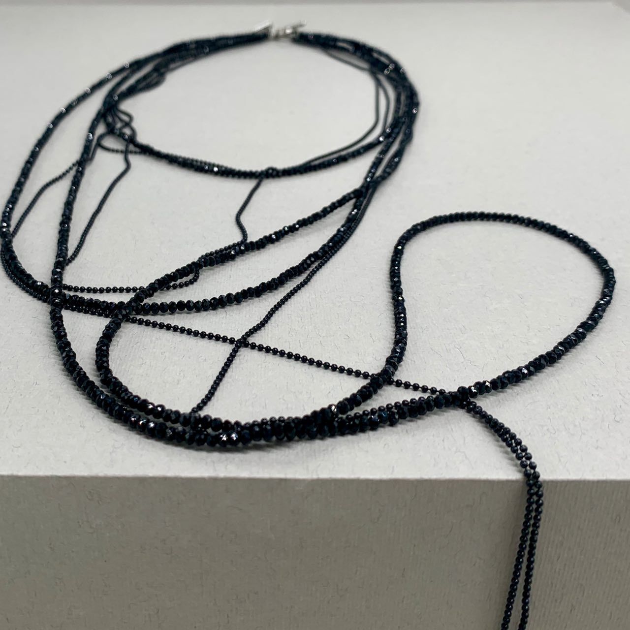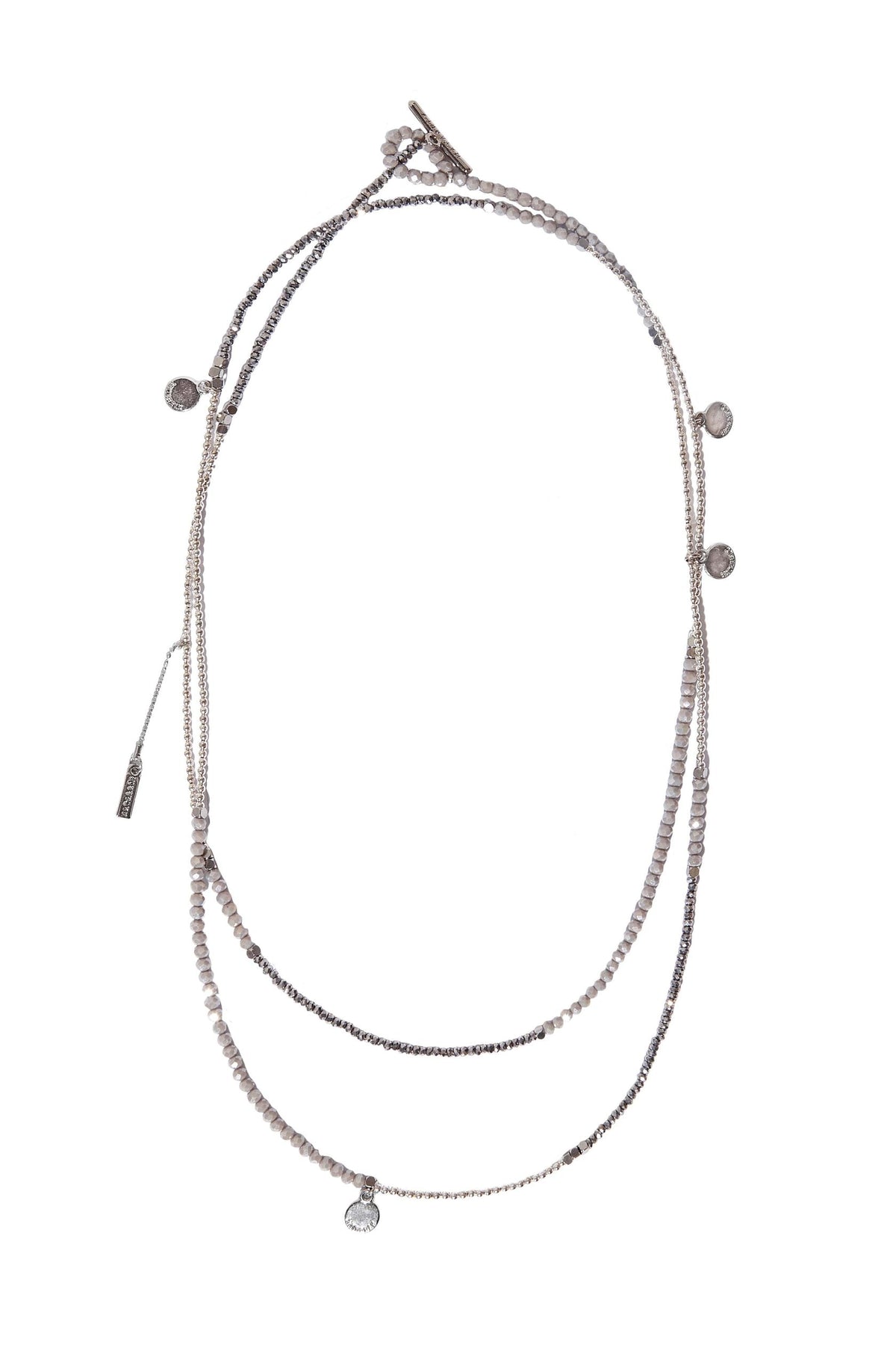 Graphite-colored crystal beads, thanks to their faceting, refract light in a special way, creating an effect of incredible radiance. Flat cord made of natural brown leather. Magnetic lock and branded hardware are rhodium plated to protect against scratches and abrasion.