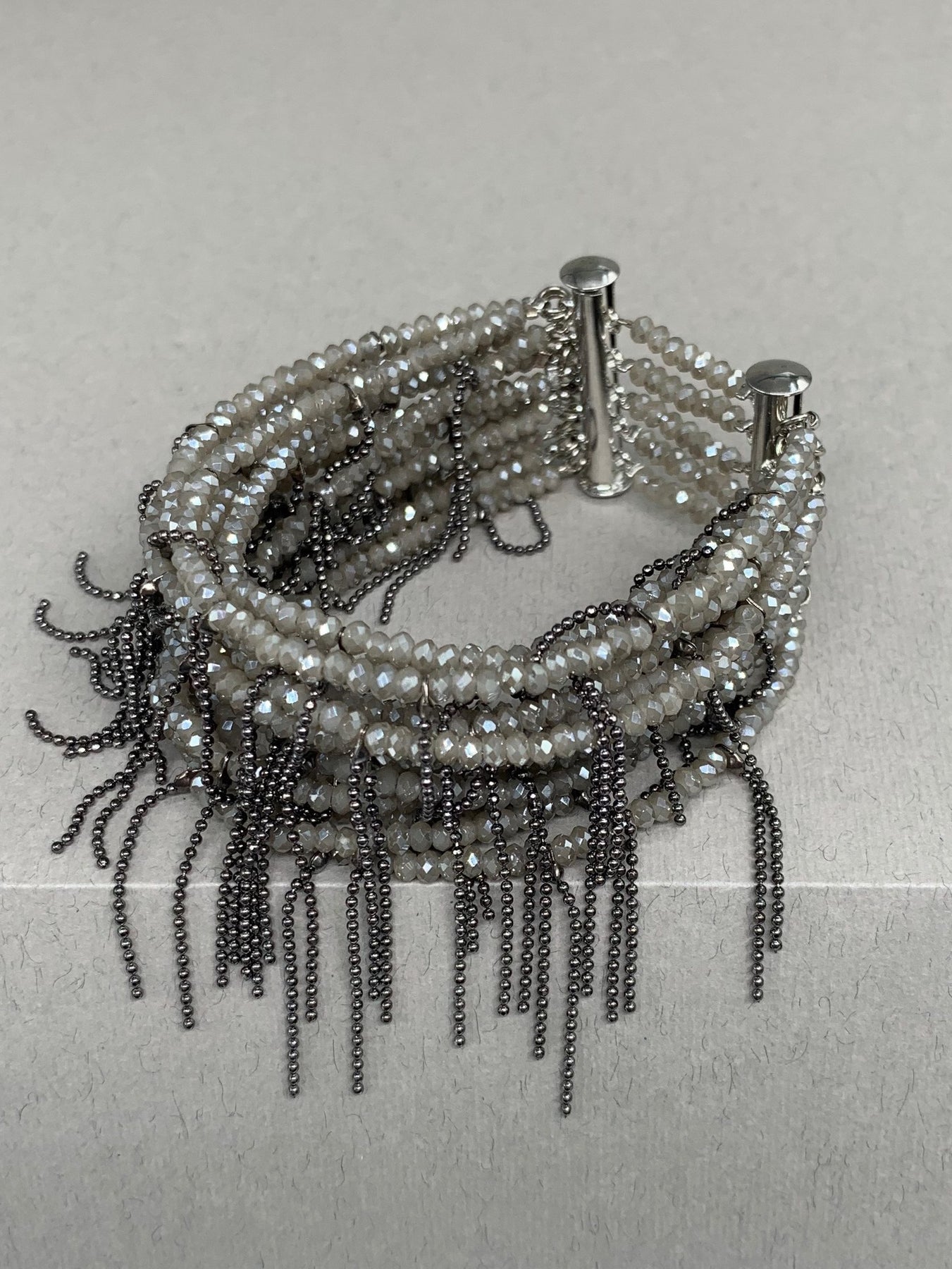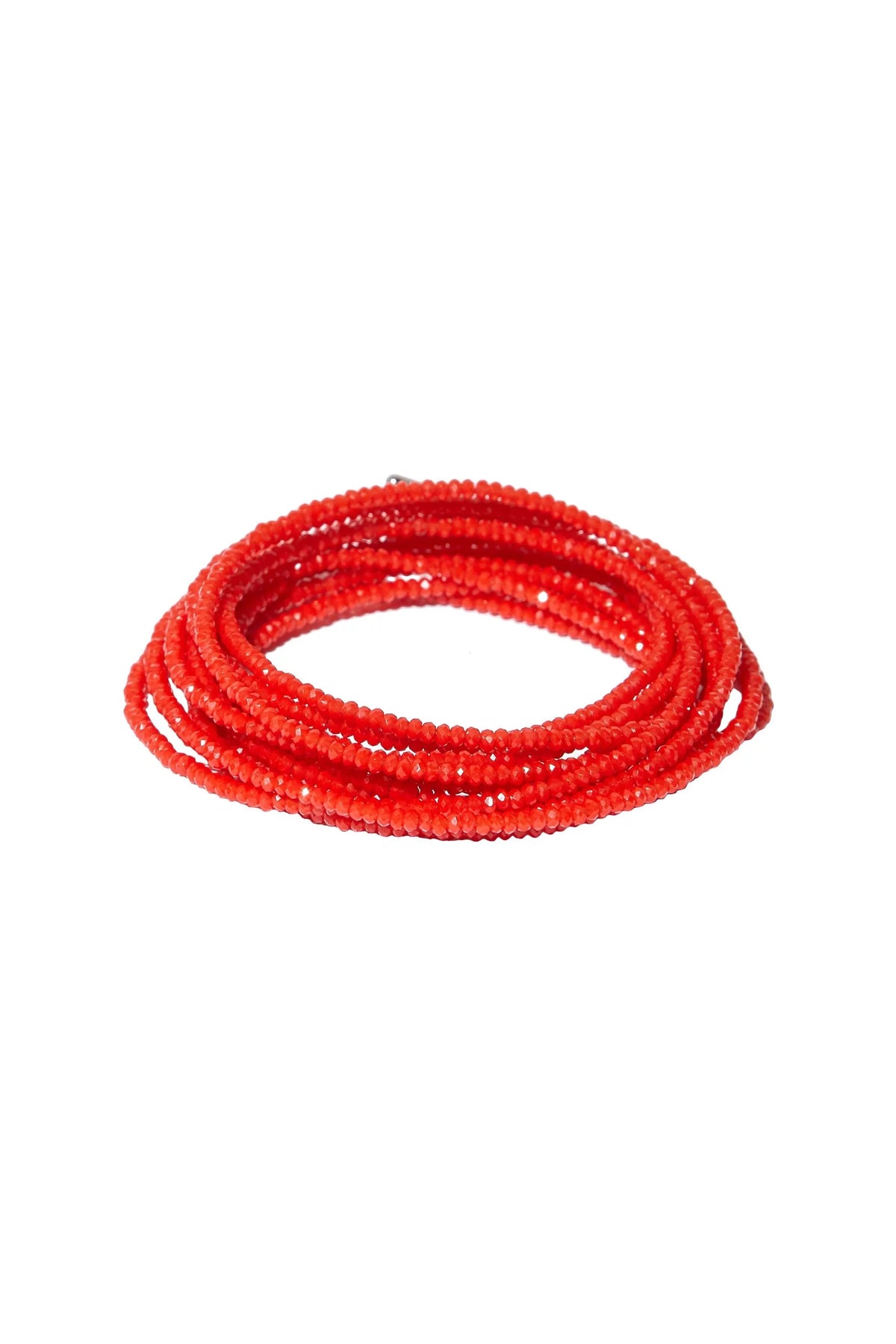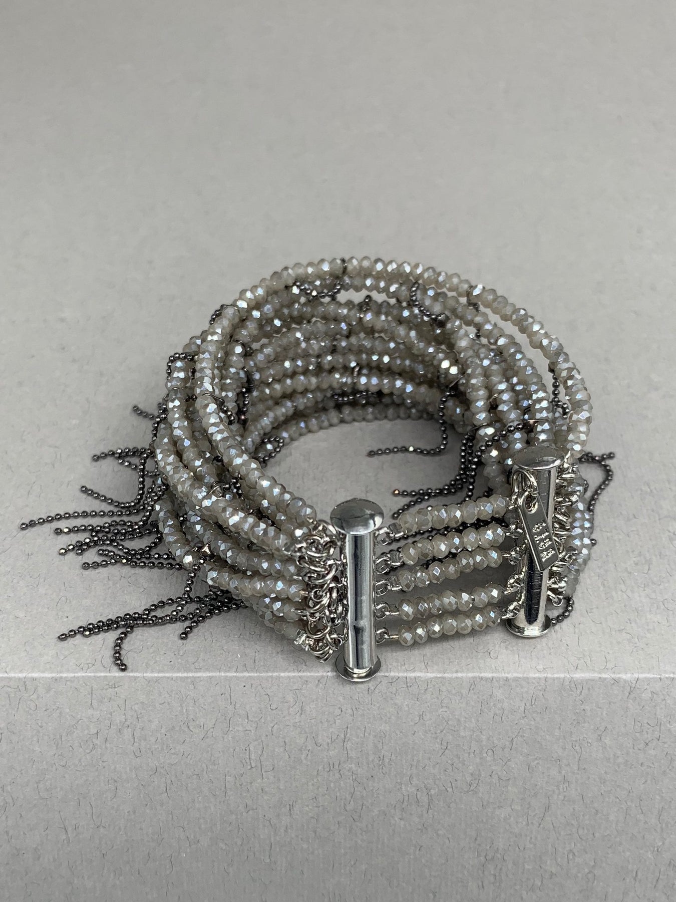 The perfect combination of sparkling crystals of a complex chocolate hue, dark monili threads and natural leather cords. Natural materials and shining elements of crystal and magic threads naturally intertwine ultra-modern textures and warming African notes, while wooden beads add even more color to the jewelry. Can be worn as a thick bracelet wrapped twice around the wrist or as a necklace.