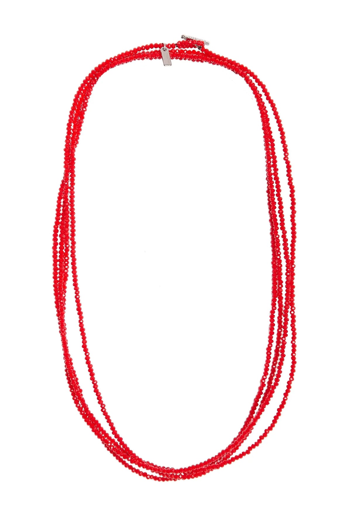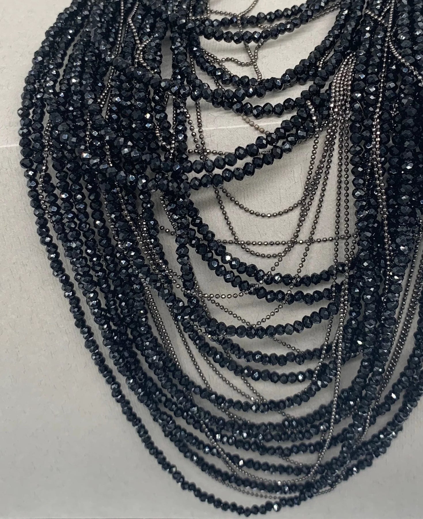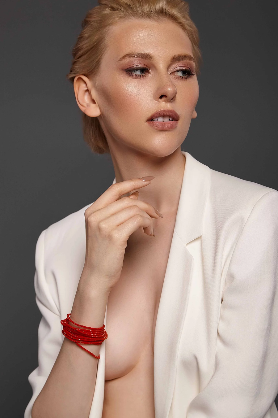 The perfect combination of sparkling crystals of a complex chocolate hue, dark monili threads and natural leather cords. Natural materials and shining elements of crystal and magic threads naturally intertwine ultra-modern textures and warming African notes, while wooden beads add even more color to the jewelry. Can be worn as a thick bracelet wrapped twice around the wrist or as a necklace.