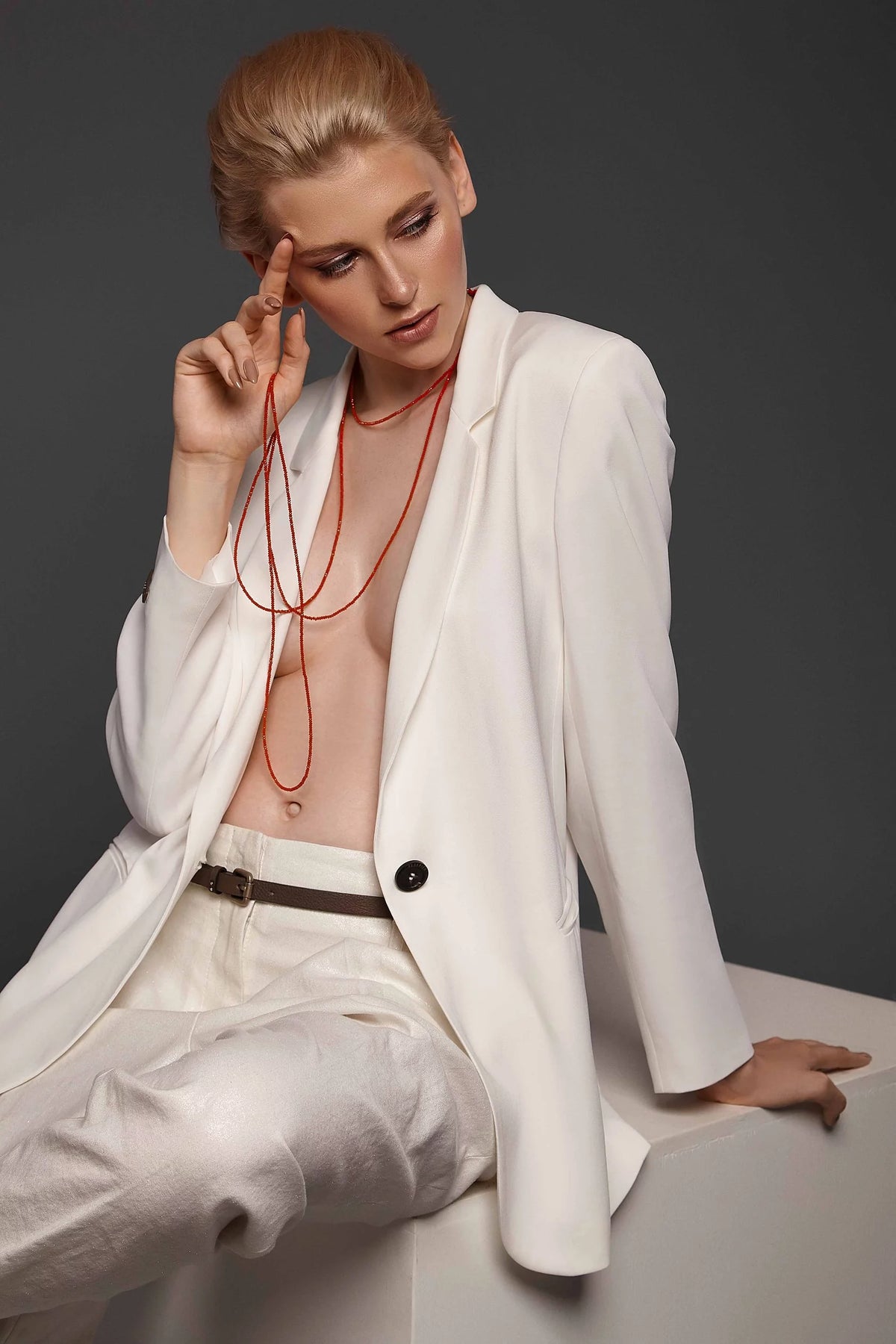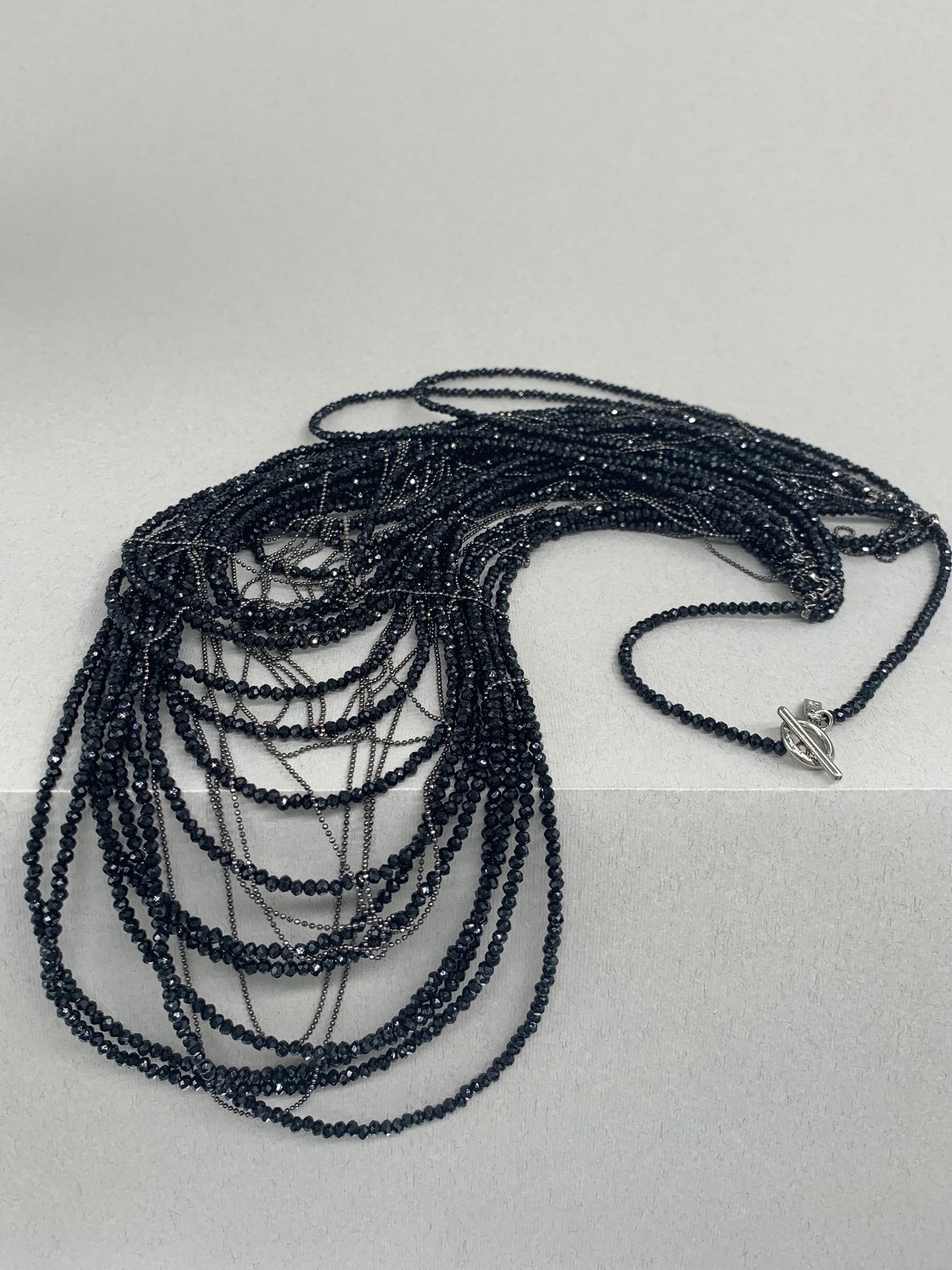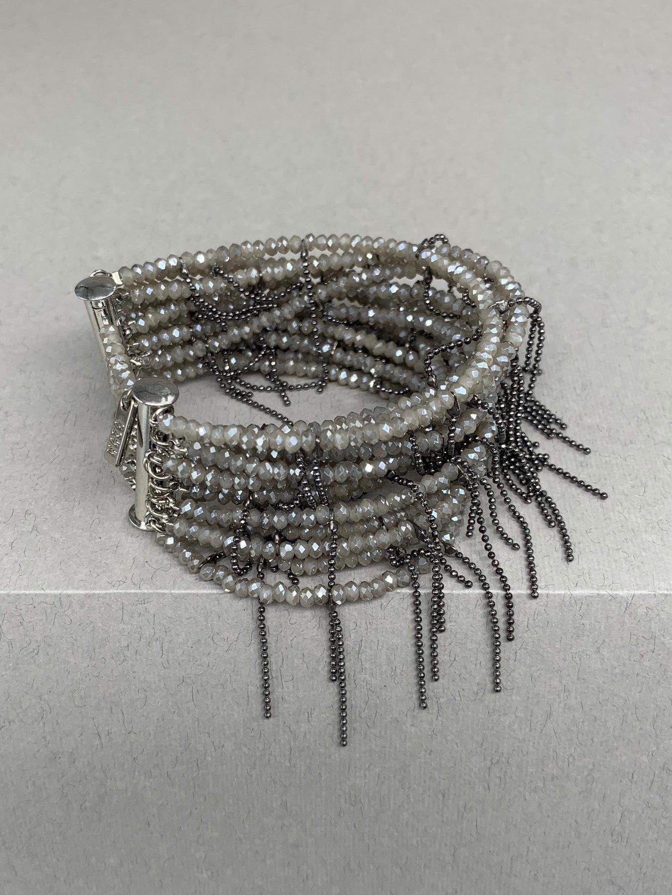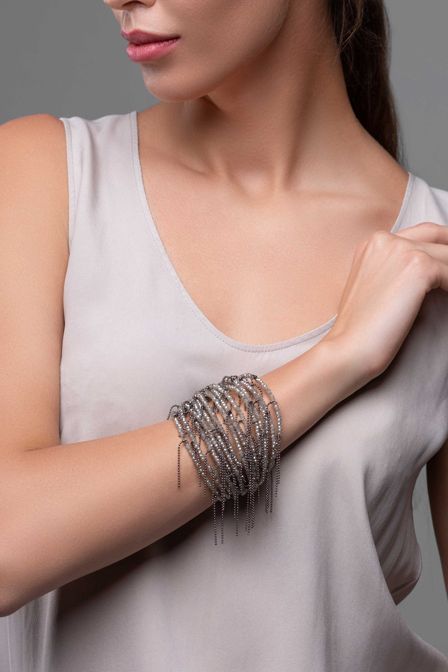 Brownish-graphite crystal beads, thanks to their cut, refract light in a special way, creating the effect of incredible radiance. The threads are alluringly black. Natural leather cords and brown wooden beads. The convenient branded lock has a rhodium plated finish that protects against scratches and abrasion.
